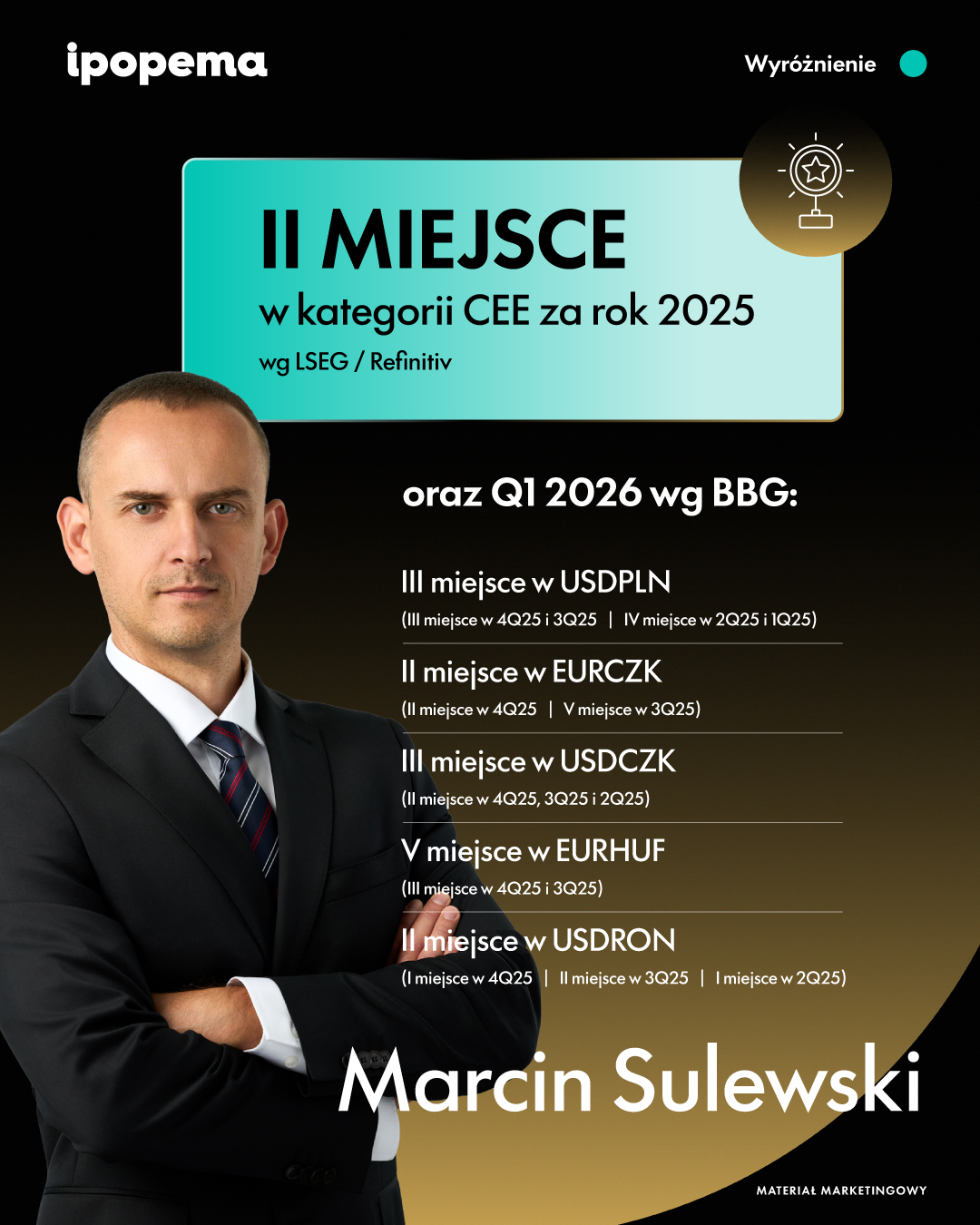 Gratulujemy Marcinowi konsekwentnie wysokich wyników i dziękujemy za wkład w rozwój kompetencji analitycznych IPOPEMA Securities na rynku FX!